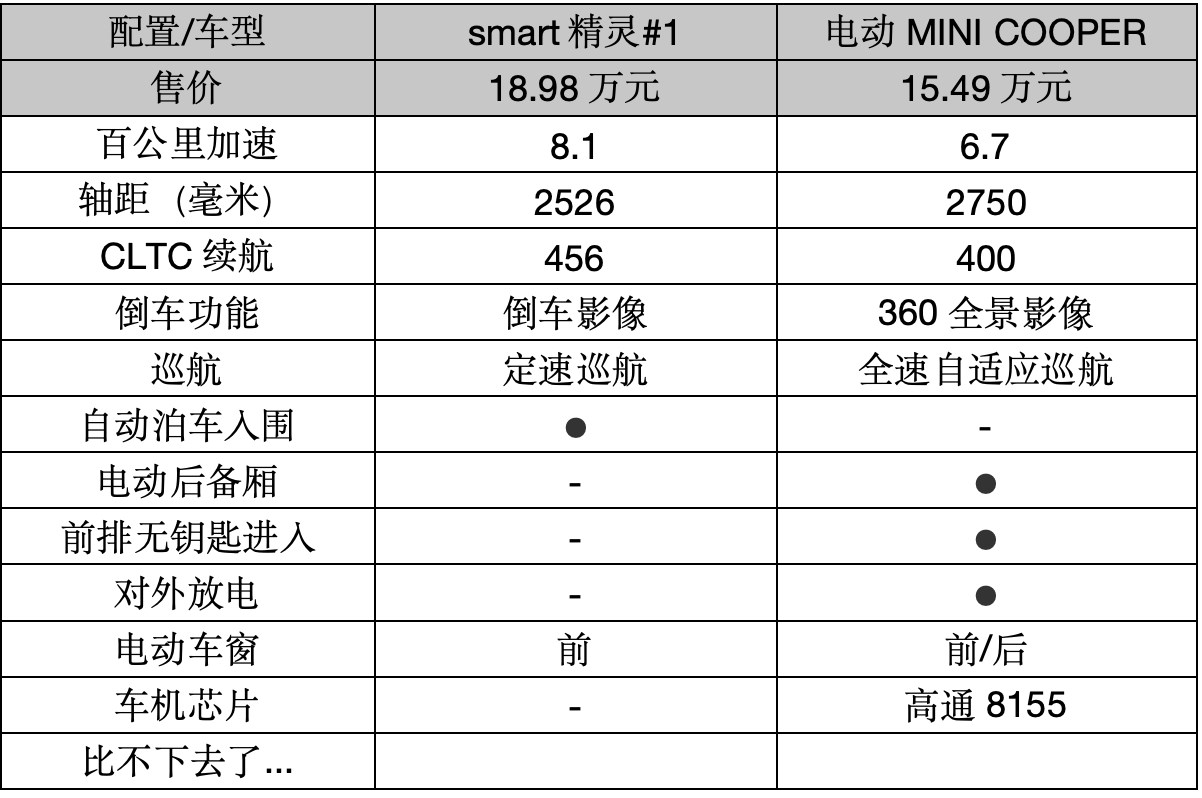 即使如此,銷量依然不盡人意,相關數據顯示,其今年1-5月份上險量9099輛,同比下滑53.6%,況且smart精靈#1的配置還比電動MINI COOPER優(yōu)秀那么多!